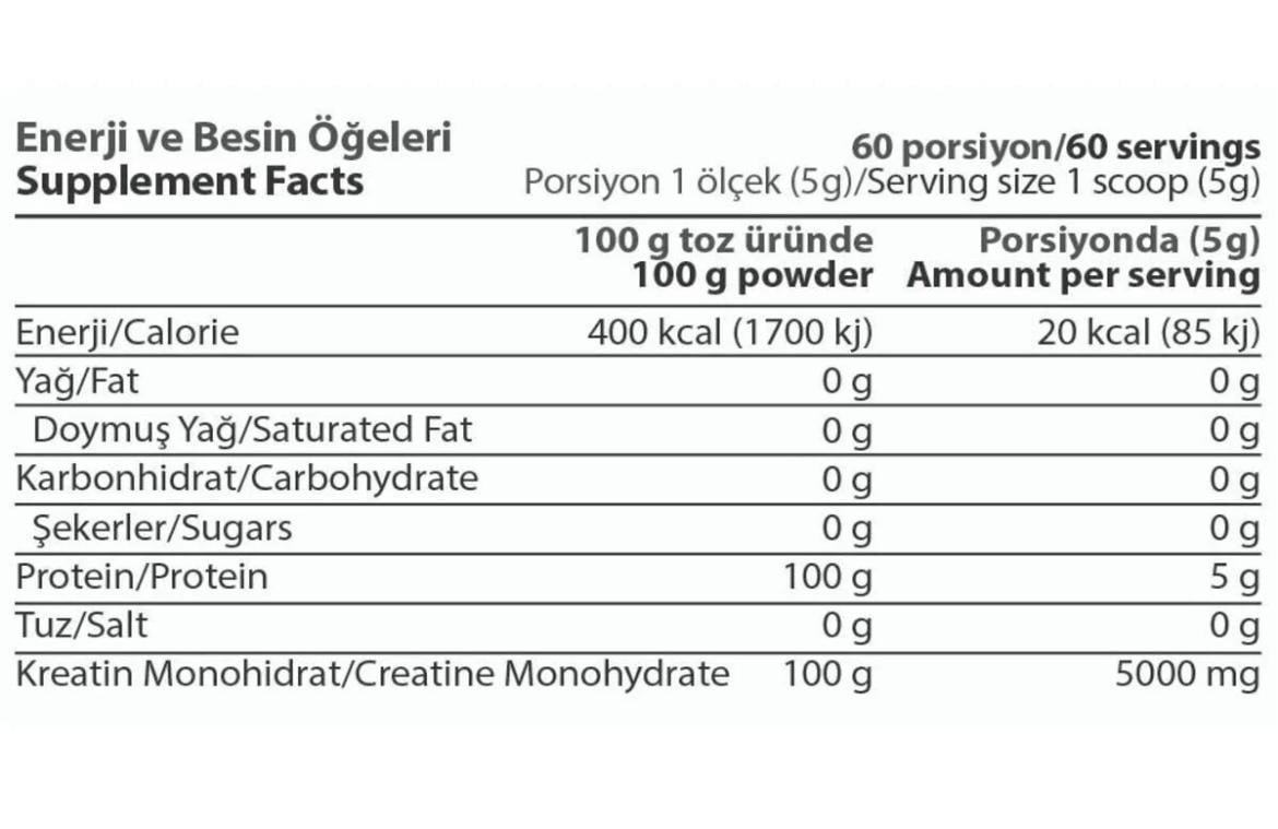 Toz Kullanim şekli: Kreatin monohidratin kullanılması ve yüklemesi, 6 haftalık kullanım periyodu ve sonrasında 1 haftalık dinlenme süresi olarak önerilir. İlk hafta 4x5 gr (günde 20gr) yükleme, sonraki 2.-6. haftalarda günlük 5gr kullanım, 7.hafta dinlenme süresi olarak veya sağlık uzmanınızın öngördüğü şekilde kullanılır.