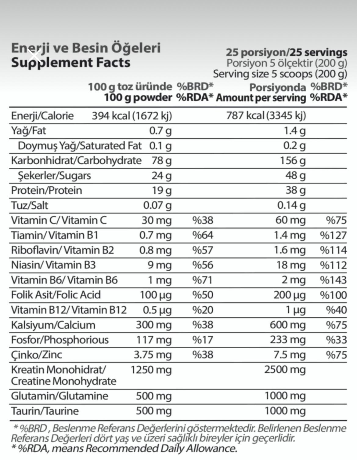 - Hardline Progainer 5000 her 1 servisinde 787 kalori bulundurur